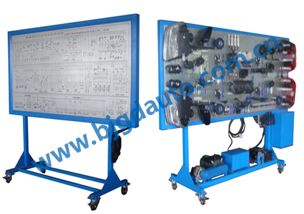 設(shè)備采用原車電器電控系統(tǒng)器件組成,包括:發(fā)動(dòng)機(jī)電控系統(tǒng)、電源系統(tǒng)、起動(dòng)系統(tǒng)、照明系統(tǒng)、儀表系統(tǒng)、信號(hào)系統(tǒng)、音響系統(tǒng)、玻璃清潔系統(tǒng)、中控門鎖、玻璃升降器、電動(dòng)后視鏡、汽車?yán)群托铍姵氐?。外加系統(tǒng)主要包括: 故障設(shè)置系統(tǒng)、故障顯示裝置、驅(qū)動(dòng)電機(jī)、電源總開關(guān)、檢測端子以及安全防護(hù)裝置等。本臺(tái)架可以完整展示汽車電器電控系統(tǒng)的組成、結(jié)構(gòu)和工作原理,可以進(jìn)行電器電控系統(tǒng)常見故障的模擬、診斷和檢測實(shí)操訓(xùn)練,提高學(xué)生分析和解決實(shí)際問題的能力,適合中高等汽車院校與培訓(xùn)機(jī)構(gòu)對(duì)學(xué)員進(jìn)行汽車電器電控系統(tǒng)的教學(xué)需要。