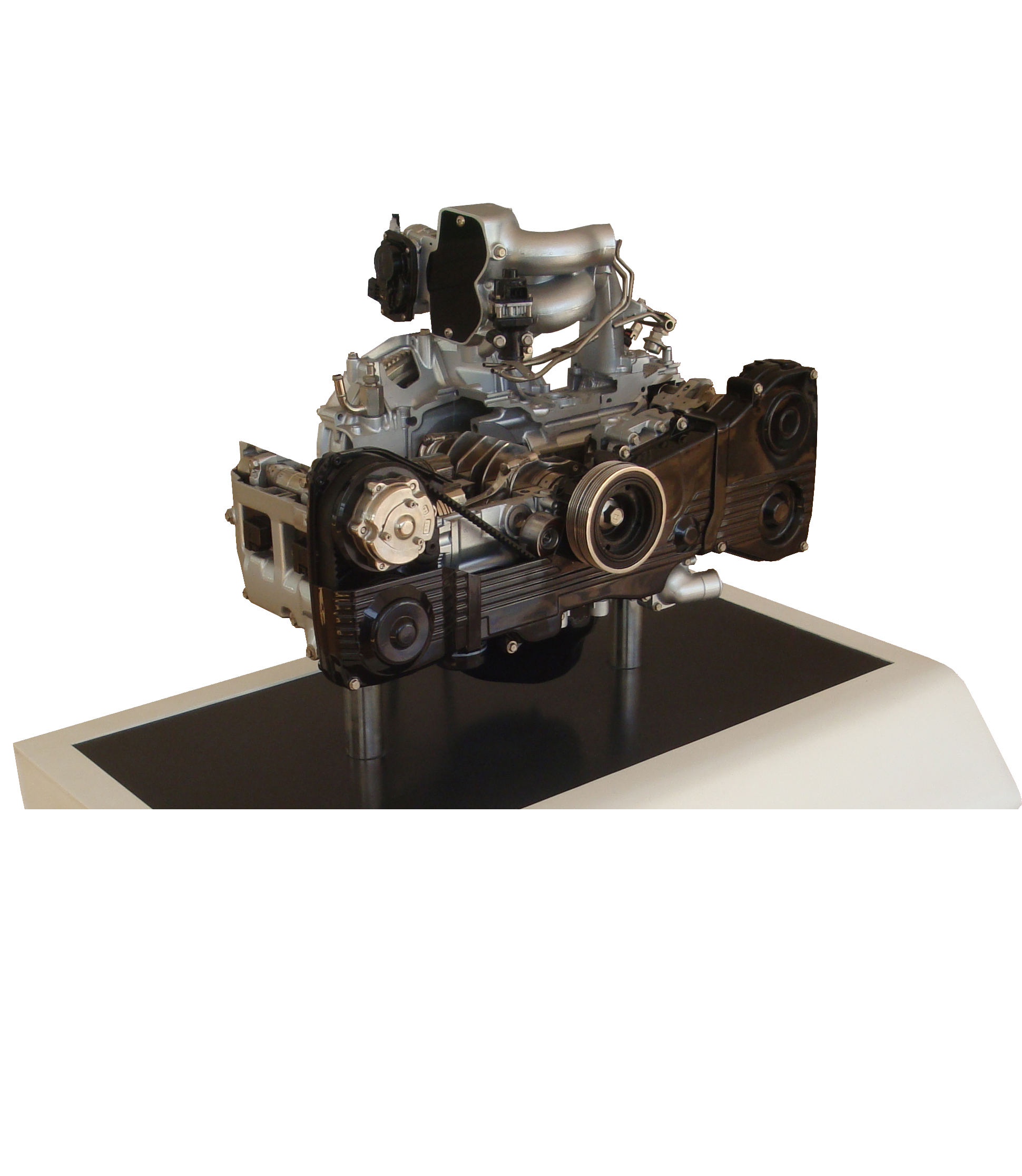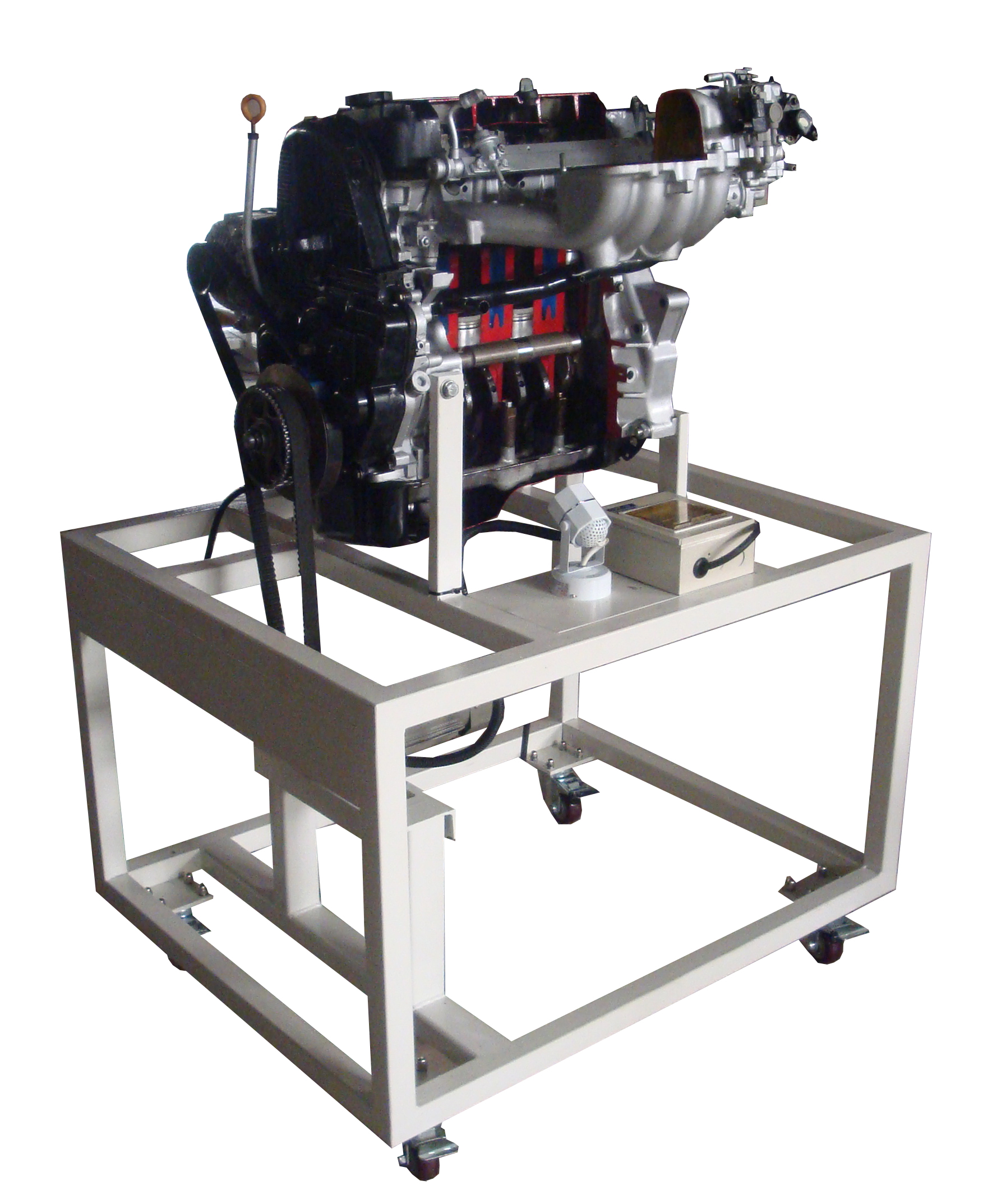 備采用電控發(fā)動機總成實物制作,發(fā)動機的關鍵部位加以爆炸式解剖,解剖剖面采用硬拉絲鍍膜工藝、精細分色,內部和外部機件電鍍處理,其他部件鈍化防腐,根據用戶要求采用各種材質、各種形狀的底座。發(fā)動機采用減速電機驅動。配置射燈直觀、清晰觀察發(fā)動機的組成和機構的運動關系,采用光電程控技術,通過LED燈顯示發(fā)動機各缸工作狀態(tài)。氣缸、活塞、曲軸連桿、凸輪軸、進氣門、排氣門、氣門頂、火花塞、噴油器、進氣歧管、排氣歧管、發(fā)電機、機油泵、水泵、節(jié)溫器、噴油嘴、節(jié)氣門體等內部結構清晰可見。利用本實驗臺可以使學員輕松、真實地了解發(fā)動機機械系統(tǒng)的組成、各部件的外形、各機構彼此之間的連接和運動關系,加深學生對發(fā)動機機械系統(tǒng)組成和工作原理的理解,幫助學生理解抽象的控制理論。本實驗臺制作精致,設計合理,安全可靠,教學功能完備,是各類培訓機構講授汽車發(fā)動機結構課程的理想教學平臺。